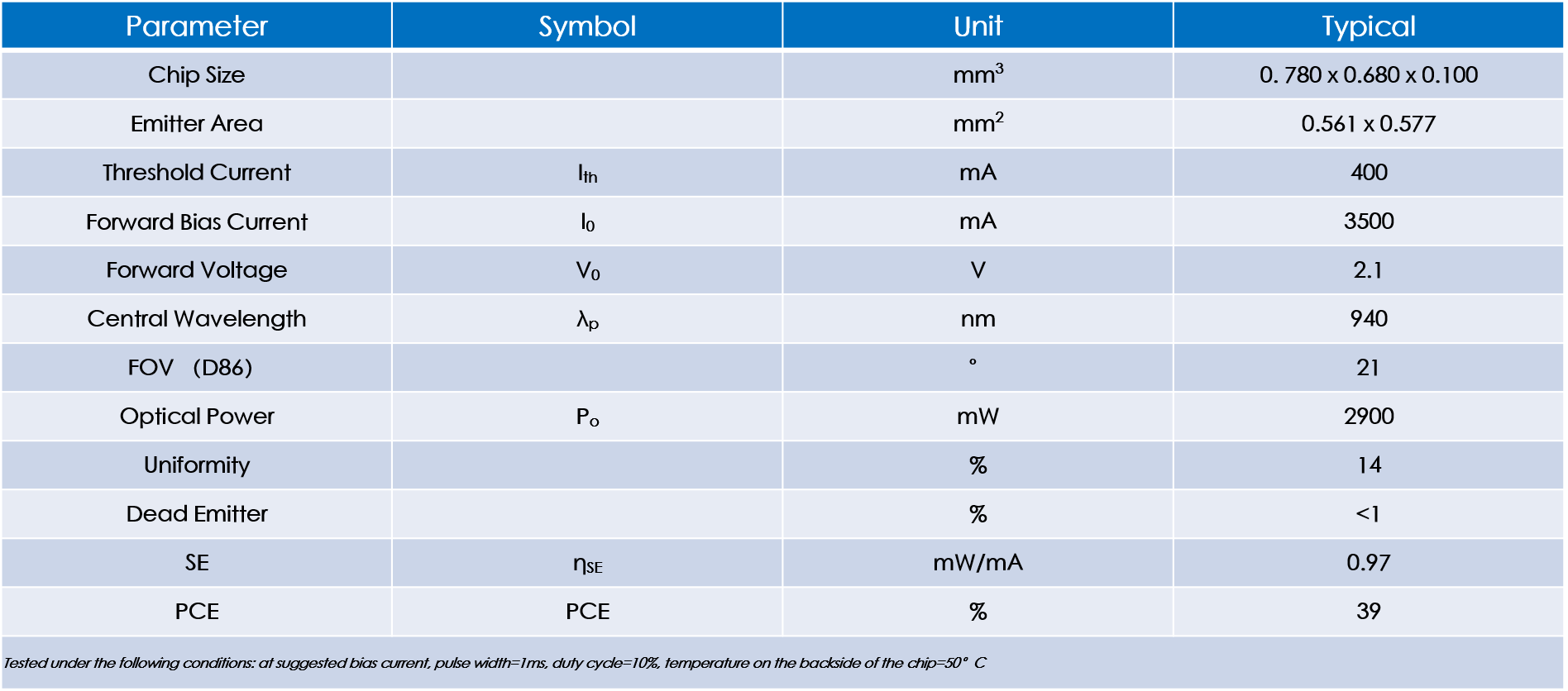 規(guī)則陣列940nm VCSEL(單邊打線) 功率:2.9W PCE:39%