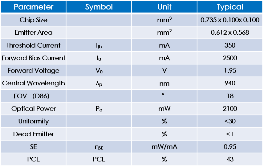 非規(guī)則陣列940nm VCSEL 功率:1.75W PCE:42% 可定制pattern開發(fā)