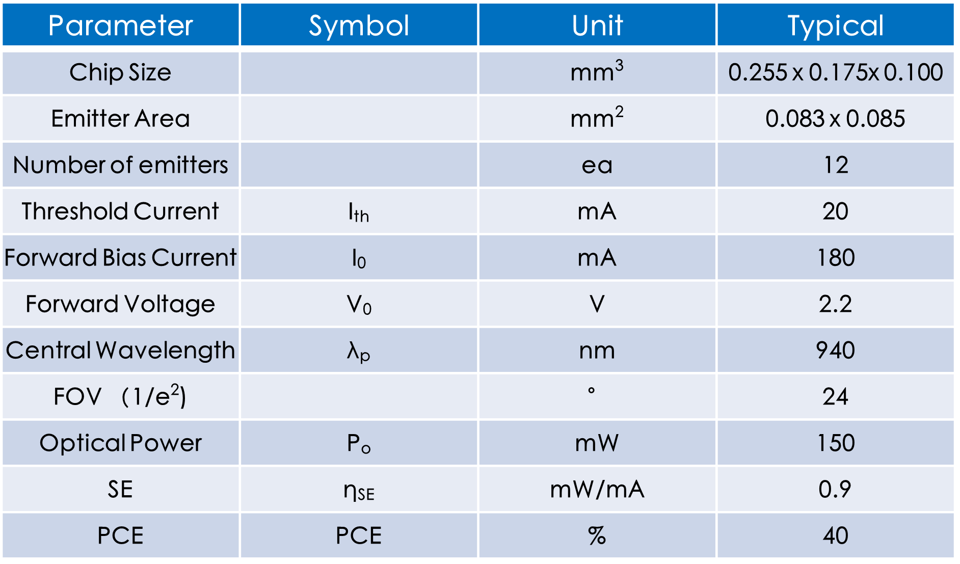 多點(diǎn)940nm VCSEL 直流功率:150mW 發(fā)散角:24°