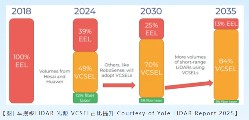 ? ? ? 在半固態激光雷達中,掃描部件通常采用 MEMS 或棱鏡/轉鏡的方式,而激光的光源也逐漸從光纖激光器或 EEL 切換至 VCSEL。自 2024 年起,VCSEL 在半固態激光雷達中的出貨量已經接近50%。隨著 VCSEL 在新一代激光雷達系統中展現出的低溫漂系數、窄線寬、低功耗等優勢,采用 VCSEL 的激光雷達比例將會逐步上升。