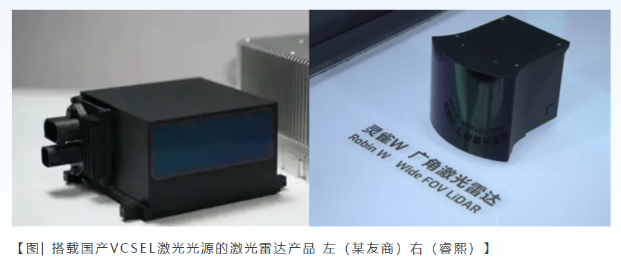 ? ? ? 2024 年量產上車的激光雷達中,除了來自海外廠商(如 Lumentum)的 VCSEL 產品外,國產 VCSEL 芯片也已經逐步實現前裝上車。例如,某友商的 VCSEL 芯片被應用于華為系的 D3 主雷達,而睿熙科技的 VCSEL 芯片則被用于圖達通系Robin-W靈雀W廣角激光雷達。邁入 2025 年,搭載國產 VCSEL 芯片的全固態激光雷達產品也將逐步在量產車型上得到應用。