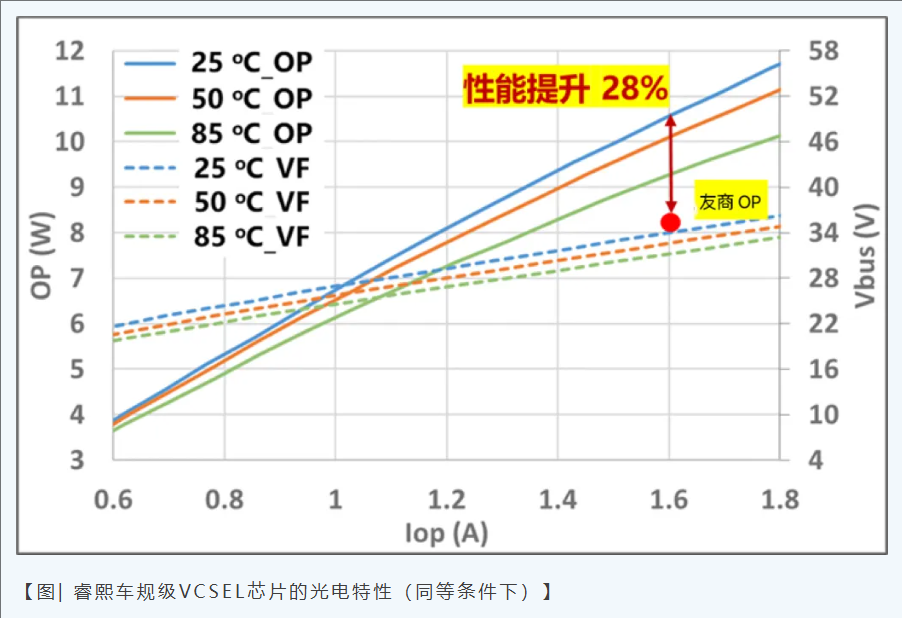 ? ? ? 在相同激光照射距離下,更高的 PCE 可以實現更遠的探測距離,或者在相同距離下實現更低的功耗。得益于睿熙的重構多結 SOMJ 架構,在同等測試條件下,睿熙 VCSEL 芯片能夠相較友商提升 28%。