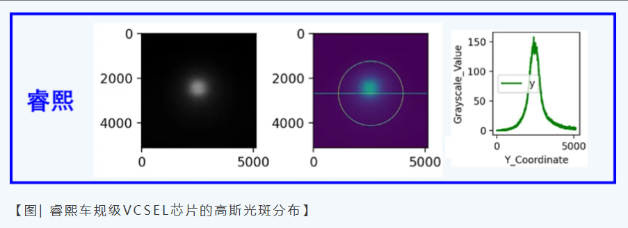 ? ? ? 低發散角有助于簡化激光雷達的光路設計并提升激光雷達的測距范圍。得益于睿熙的重構多結架構,睿熙 VCSEL 芯片已經可以做到 8°~10°的發散角,並且呈現高度集中化的高斯光斑分布,這將大大簡化光學設計并提升激光雷達的測距能力。